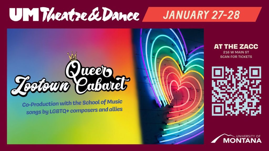 A Co-Production of UM School of Theatre & Dance and UM School of MusicFriday & Saturday // January 27 & 28 // Door at 7 PM // Show at 7:30 PM // $17 General Admission // $10 Student ‘Queer Cabaret’ is a revue of songs by LGBTQ+ composers from a wide array of styles and periods, featuring the talented students of Zootown Cabaret, UM’s musical-theatre performance ensemble. For further information, accessibility, and inquiries please visit https://www.zootownarts.org/meet-the-zacc/about/.